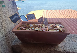 Entrámos numa loja que tinha uma varanda para o oceano e qual o nosso espanto 🫢... ao ver tanta moeda espalhada pelo telhado e nos vasos 😜